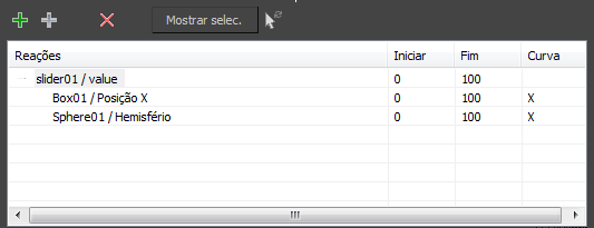 A lista de Reações exibe uma vista hierárquica das relações do driver/orientadas de objetos com controladores de Reação na cena. Use seus controles para adicionar e excluir drivers e itens orientados, alterar quadros iniciais e finais e alternar o uso da curva de gráfico. Estes controles estão disponíveis na barra de ferramentas acima da lista e na própria lista.