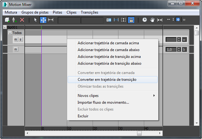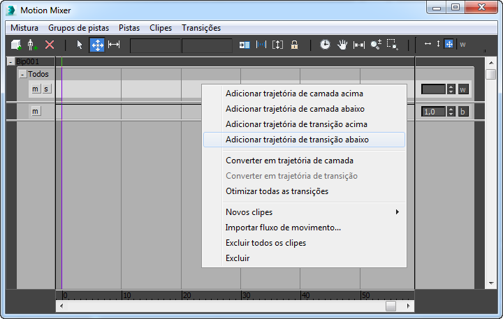 No Motion Mixer, você inicia o processo de mistura abrindo o Mixer e, a seguir, adicionando objetos a misturar e carregando, de seguida, clipes de movimento para trilhas de clipe. Uma trilha de clipe é criada automaticamente se um bípede for selecionado enquanto abrir o Mixer, mas você provavelmente precisa de mais para obter todos os movimentos que deseja usar com seu objetos misturados.