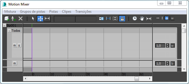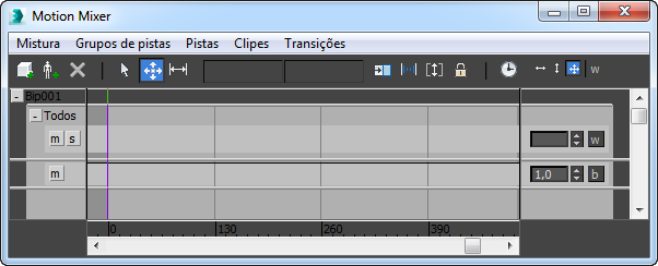 Quando você abrir o Mixer enquanto um bípede for selecionado, um grupo de trilha, uma trilha de clipe e uma trilha de equilíbrio são atribuídos ao bípede. Se um objeto não bípede for selecionado, o Mixer abre vazio.