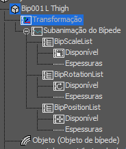 - Expande a lista Hierarquia automaticamente com base nas escolhas de seleção do submenu. As escolhas do submenu são: Apenas objetos selecionados, Transformações, Componentes XYZ, Limites, Animável, Animados, Objetos de base, Modificadores, Materiais e Filhos.