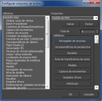 O 3ds Max atualiza a implementação de Utilitários. É possível personalizar o conjunto de botões sem salvá-lo, mas se você salvar um novo conjunto de botões com um novo nome, você poderá usá-lo posteriormente.
