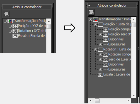 Substitui os controladores de posição e rotação atuais do objetos selecionados pelos controladores de lista que contêm a configuração Congelar transformação. Esta configuração compreende um controlador de posição congelada (Bezier)/Rotação (Euler XYZ) seguido por um controlador "zero...", que utiliza o controlador padrão para a transformação (posição XYZ e Euler XYZ, respectivamente). Uma vez que você tenha “congelado” uma transformação de objeto, é possível voltar para a sua posição e orientação como congelado com o comando Transformação para zero (consulte a seguir).