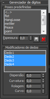 Uma vez que é possível transformar dedos (dígitos) diretamente, você pode preferir utilizar o Gerenciador de dígitos em vez disso. Os controles permitem editar extensão, dobra, rolagem e curvatura dos dedos selecionados. O Gestor de dígito também tem um gestor pré-definido com pose de dígito embutido.