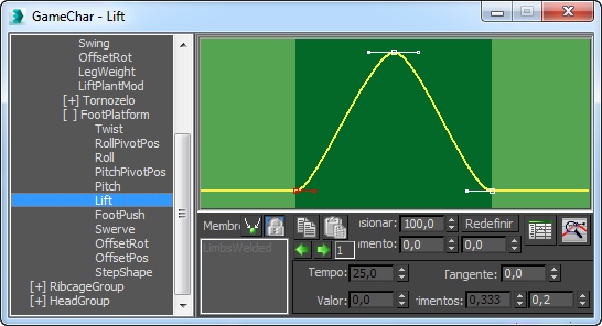 Todos os controladores, exceto OffsetRot e OffsetPos têm gráficos para exibir a curva para o movimento do controlador selecionado dentro do ciclo de movimento.