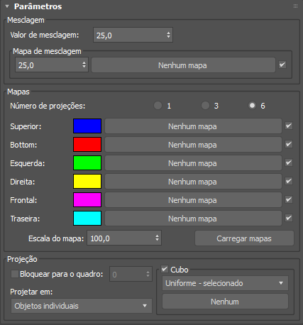 Você pode escolher se deseja projetar uma cor ou um mapa em cada lado disponível, utilizando as caixas de seleção de cor e mapa (padrão = Nenhum mapa).