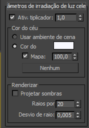 - O número de raios usados para calcular a queda da clarabóia em um determinado ponto na cena. Para animação, você deve definir esta opção para um valor alto para eliminar piscadas. Um valor de cerca de 30 deve eliminar a piscada.