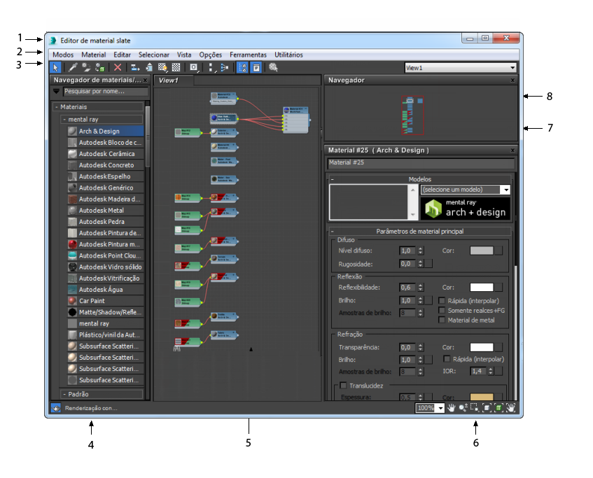 A interface Slate é uma interface gráfica com vários elementos. Os mais importantes são o Navegador de materiais/mapas, em que é possível procurar por materiais, mapas e material de base e tipos de mapas; a Vista ativa, na qual você pode combinar materiais e mapas; e o Editor de parâmetros, em que é possível alterar as configurações de material e de mapa.