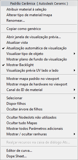 Mapas(Só aparece para materiais e para mapas que têm componentes mapeáveis). Esse submenu mostra os diferentes componentes mapeáveis do material ou mapa, como valores de cor e configurações numéricas. Selecione um componente para ocultar ou exibir.