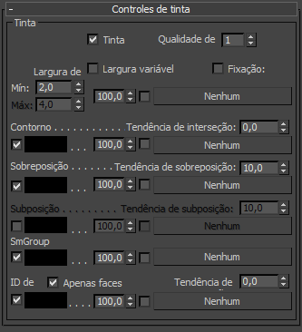 Há controles de mapa para cada um dos componentes de tinta: Largura, Contorno, Sobreposição, Subposição, SmGroup e ID do material. Eles funcionam da mesma maneira que para os componentes de pintura do material , como descrito anteriormente.