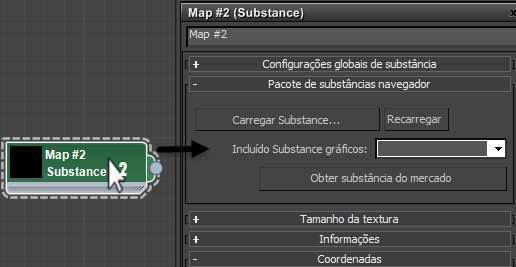 Após abrir o arquivo Substance, o 3ds Max insere automaticamente um nó de mapa Seletor de saída do mapa entre o nó de substâncias e o nó de material. Este nó é necessário para a maioria de substâncias que produzem diversos tipos de saída (ou canais) simultaneamente. (algumas substâncias produzem somente um tipo de saída; estas não precisam do seletor de saída do mapa). Você pode usar Selecionar saída do mapa para alterar o tipo de saída do mapa de substâncias que está conectada com o material de soquete sem precisar reconectar os dois nós.