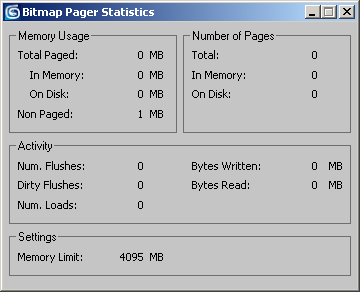 A caixa de diálogo Estatísticas do pager de bitmap fornece informações para ajudá-lo a resolver problemas com cenas que requerem uma grande quantidade de memória para mapas de textura. Ela foi projetada para os usuários avançados depurarem as cenas e ajudar a reduzir os tempos de renderização.