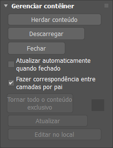 A implementação Gerenciar container permite que você abra, feche, herde, salve e atualize containers em sua cena. Ela também permite que você converta um container de origem em um container único.