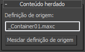 A implementação Conteúdo herdado identifica o caminho e o nome da definição de container de origem atualmente selecionada, o arquivo de onde você herda o conteúdo e permite que você mescle o conteúdo em sua cena.