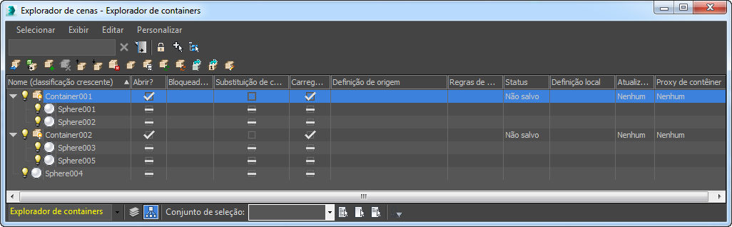 Essa barra de ferramentas está presente no Container Explorer e pode ser adicionada a qualquer Scene Explorer com a opção Personalizar Barras de ferramentas Container.