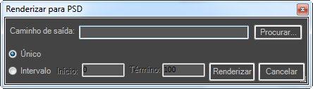 - Abre a caixa de diálogo Renderizar para PSD para gerar e salvar uma imagem de bitmap com formato de Photoshop com base no nó de Saída do compositor. Clique no botão Procurar para definir o caminho de saída e o nome do arquivo e clique em Renderizar.