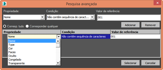 Por exemplo, se você definir Propriedade = Nome, será possível escolher Condição = Contém cadeia de caracteres para que seja possível pesquisar uma cadeia de caracteres de texto em qualquer lugar nos nomes de objeto.