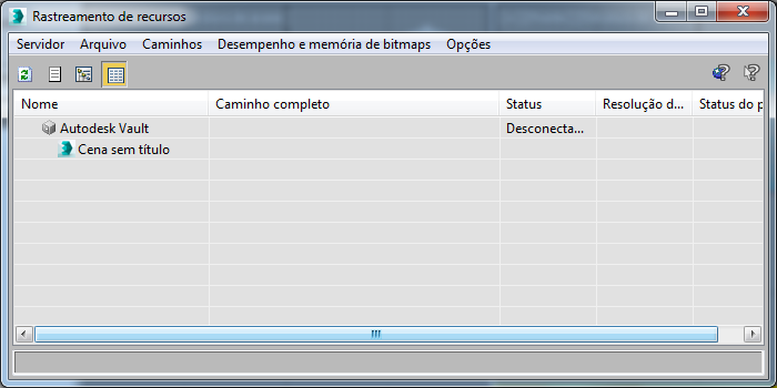 Exibe uma lista dos recursos da cena atual no formato tabular, juntamente com o caminho completo e o status da versão local da cada recurso. As ramificações são hierárquicas, mas não podem ser expandidas ou retraídas.