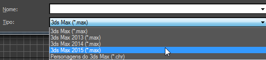 Na lista suspensa Salvar como tipo, selecione uma versão anterior do 3ds Max. É possível salvar em formatos de até 3 versões anteriores.