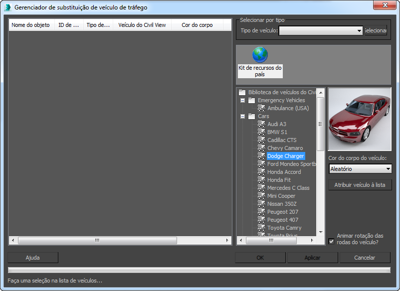 Permite que você escolha tipos de veículo do Civil View aleatórios ou individuais a serem aplicados a entradas selecionadas na lista de objetos de veículo.