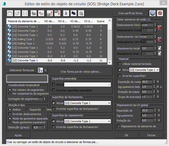 Edita as configurações do elemento atualmente realçado na lista de elementos SOS. Cada elemento representa uma única superfície no objeto varrido e tem como destaque um deslocamento horizontal e vertical, junto com uma seleção de canal de material independente.