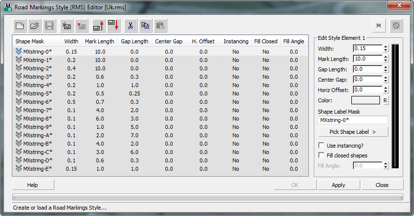 O Editor de estilo de marcas viárias permite a aplicação de uma gama de tipos de marcas viárias para um modelo de visualização ao associar um tipo de marcas viárias com uma série de máscaras de etiqueta.