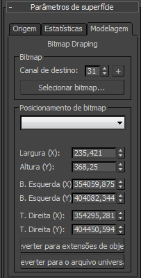 - Quando mais de um conjunto de coordenadas de modelagem está sendo utilizado no objeto de superfície selecionado, lembre-se de usar a lista suspensa para selecionar o canal de material correto antes de alterar as coordenadas de modelagem exibidas.