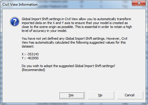Ao importar os dados de modelo que tenham uma origem diferente de zero, o Civil View calcula os valores de deslocamento X e Y e solicita que você defina: