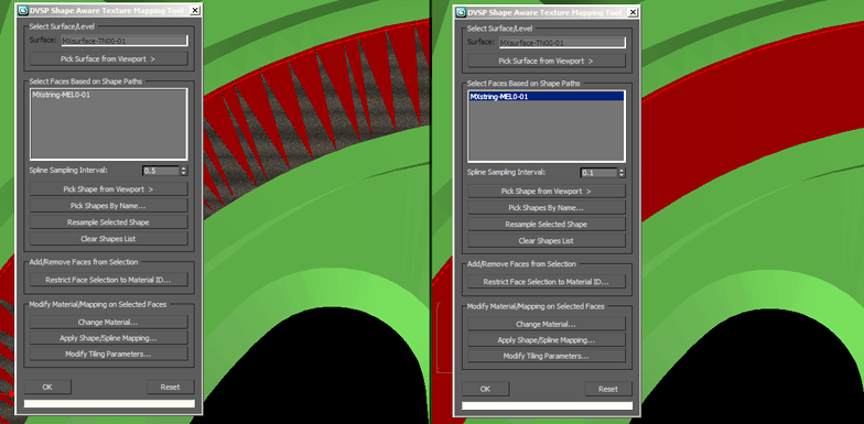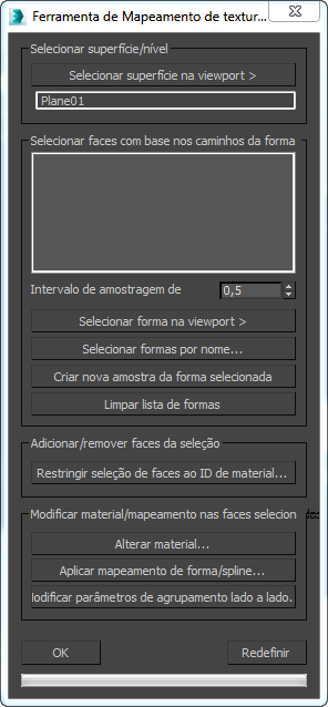 - Para determinar as faces na superfície às quais serão aplicadas modificações de mapeamento de textura. Todas as faces que cruzam o caminho da forma são selecionadas, levando em conta o Intervalo de amostragem de spline descrito abaixo.