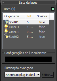 A etiqueta acima da lista mostra a quantidade de luzes noturnas que estão presentes na cena e a amostra de cor mostra a cor de estrutura de arame dos objetos de luz.