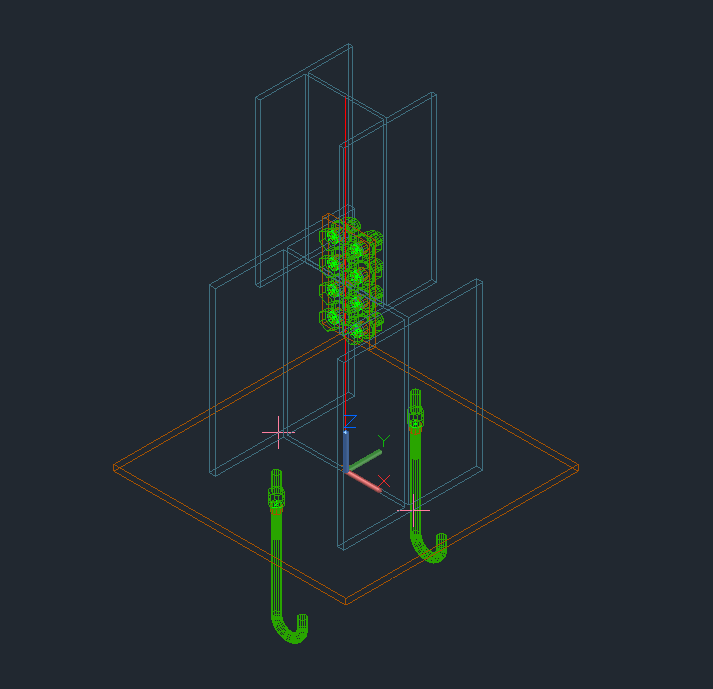 As seen in the code above, the AnchorPattern is defined the same as the FinitRectScrewBoltPattern was - by diagonally opposite corner points. Rather than using the default anchor type, this code will change the bolts used for the anchor to "French cane anchor". The AnchorPattern properties need to be set to a valid combination of properties. Valid sets of properties can be determined from the Anchors tool in the Advance Steel Management Tools (a separate application installed with Advance Steel).
