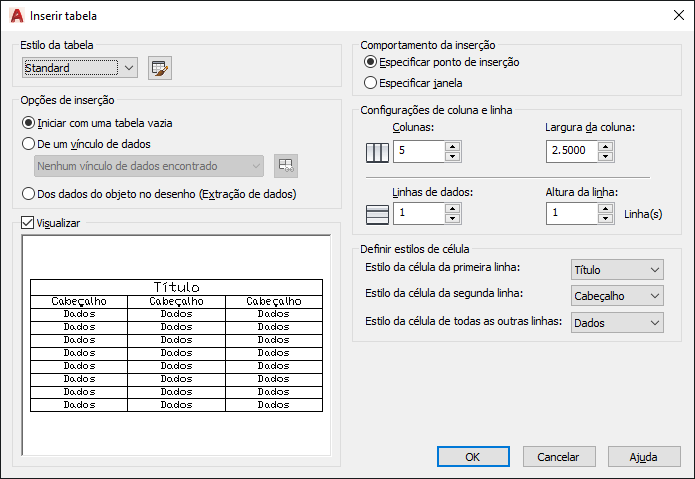 Especifica um tamanho e uma localização para a tabela. É possível utilizar o dispositivo apontador ou inserir valores de coordenadas no prompt do comando. Quando esta opção for selecionada, o número de colunas e linhas e a largura da coluna e a altura da linha depende do tamanho da janela e das configurações de coluna e linha.