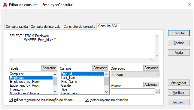 Fornece um espaço para você inserir uma consulta SQL com forma livre ou adicionar elementos selecionados utilizando diversas ferramentas de Consulta SQL.