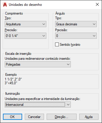 Os valores incluem Architectural, Decimal, Engineering, Fractional e Scientific. Os formatos Engineering e Architectural produzem exibições em pés e polegadas e assumem que cada unidade de desenho representa uma polegada. Os outros formatos podem representar qualquer unidade real.