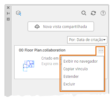 A paleta Vistas compartilhadas fornece uma forma de exibir vistas compartilhadas de um desenho e de publicar e responder a comentários de colegas e clientes através de suas contas para Web e dispositivos móveis da Autodesk.