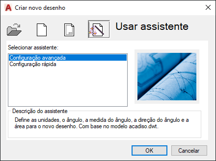 Exibe o assistente Configuração avançada, no qual é possível especificar as unidades, o ângulo, a medida e a direção do ângulo e a área para o novo desenho. O assistente Advanced Setup também altera configurações, como altura do texto e espaçamento de snap, para uma escala apropriada.