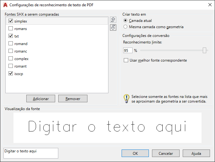 Exibe uma lista das fontes SHX na qual você pode selecionar as fontes que mais provavelmente coincidirão com a geometria SHX selecionada. A ordem das fontes SHX selecionadas é importante. As fontes selecionadas são comparadas à geometria SHX selecionada para uma correspondência iniciando na parte superior da lista até o Limite de reconhecimento especificado ser atingido ou excedido. Utilize os controles de seta para mover uma fonte selecionada para cima ou para baixo na lista. As fontes desmarcadas são ignoradas. Considere os seguintes pontos: