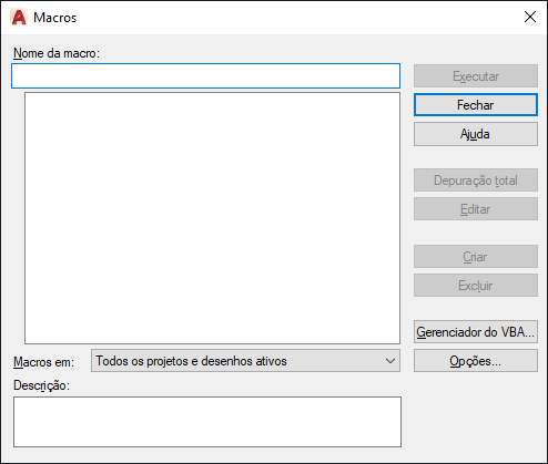 Especifica o projeto ou o desenho cujas macros estão disponíveis na lista de macros. Se seu projeto ou desenho não estiver listado, clique em VBA Manager para carregá-lo.
