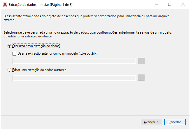 Inicia o processo de extração de dados. As opções incluem a criação de uma nova extração de dados, usando um modelo ou editando uma extração de dados existente.