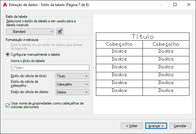 Controla a aparência da tabela de extração de dados. Esta página é exibida somente se na página Selecionar saída for selecionado Tabela do AutoCAD.