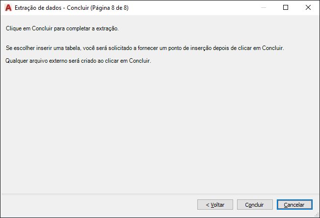 Completa o processo de extrair os dados de propriedades do objeto especificados no assistente, e cria o tipo de saída que foi especificado na página Selecionar saída. Se na caixa de diálogo Vincular dados externos tiverem sido definidos vínculo de dados e correspondência de colunas com uma planilha do Excel, os dados selecionados na planilha também serão extraídos.
