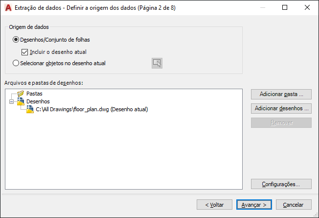 Especifica os arquivos de desenho, incluindo pastas das quais extrair os dados. Permite a seleção de objetos no desenho atual do qual extrair as informações.