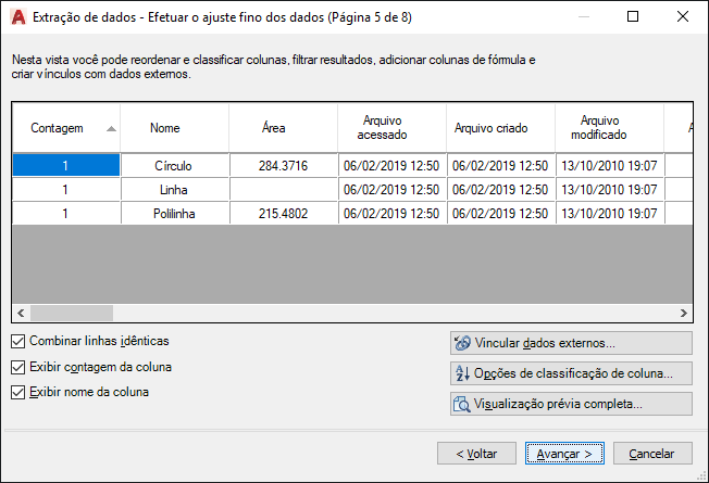As informações são usadas para criar uma tabela de extração de dados no desenho atual ou são salvas em um arquivo externo, ou ambos.