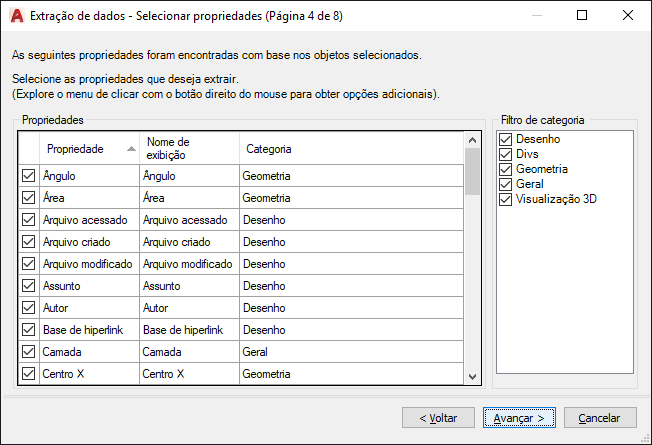 Os objetos válidos são marcados por padrão. Os objetos que não existem no desenho selecionado não são marcados. Clique no cabeçalho de coluna para inverter a ordem de classificação. As colunas podem ser redimensionadas. Os dados de propriedades dos objetos marcados são exibidos na página Selecionar propriedades.