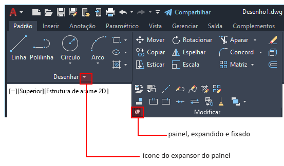 É possível puxar um painel para fora de uma guia da faixa de opções e para a área de desenho ou para outro monitor. O painel flutuante continua aberto até que seja retornado para a faixa de opções, mesmo que você troque de guia da faixa de opções.