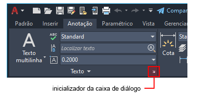Alguns painéis da faixa de opções fornecem acesso a uma caixa de diálogo relacionada ao painel. Para exibir a caixa de diálogo relacionada, clique no inicializador da caixa de diálogo que é indicado por um ícone de seta, , no canto inferior direito do painel.