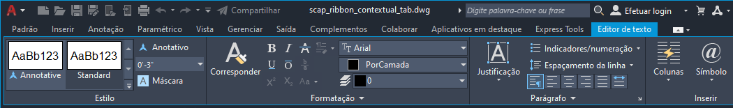 Ao selecionar um determinado tipo de objeto ou executar determinados comandos, uma guia de faixa de opções contextual é exibida, em vez de uma barra de ferramentas ou caixa de diálogo. A guia contextual fecha ao finalizar o comando.