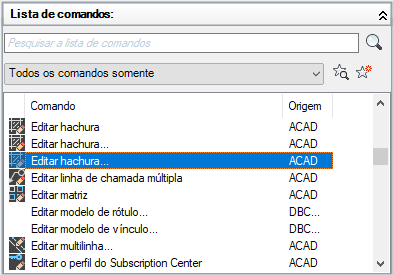 Na parte superior do painel Lista de comandos está a caixa Pesquisar lista de comandos, que permite filtrar a Lista de comandos com base na sequência de texto inserida. A sequência de texto é comparada com qualquer parte de um nome de comando e os resultados são exibidos na caixa Lista de comandos.