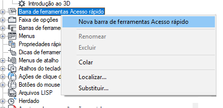 - Na guia Personalizar, no painel Personalizações em <nome do arquivo>, clique com o botão direito do mouse no nó Barras de ferramentas de acesso rápido. Clique em Nova barra de ferramentas de acesso rápido.