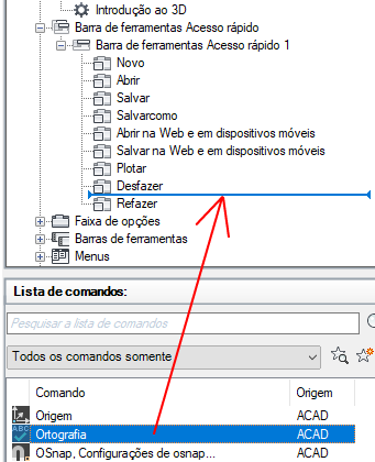 - No painel Lista de comandos, arraste o comando ou o controle que deseja adicionar à barra de ferramentas de acesso rápido no painel Personalizações em <nome do arquivo>.