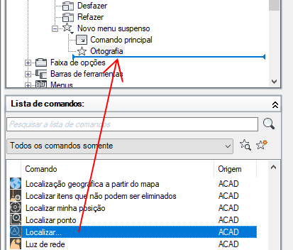 - No painel Lista de comandos, arraste o comando ou o controle que deseja adicionar ao menu suspenso no painel Personalizações em nome do arquivo>.